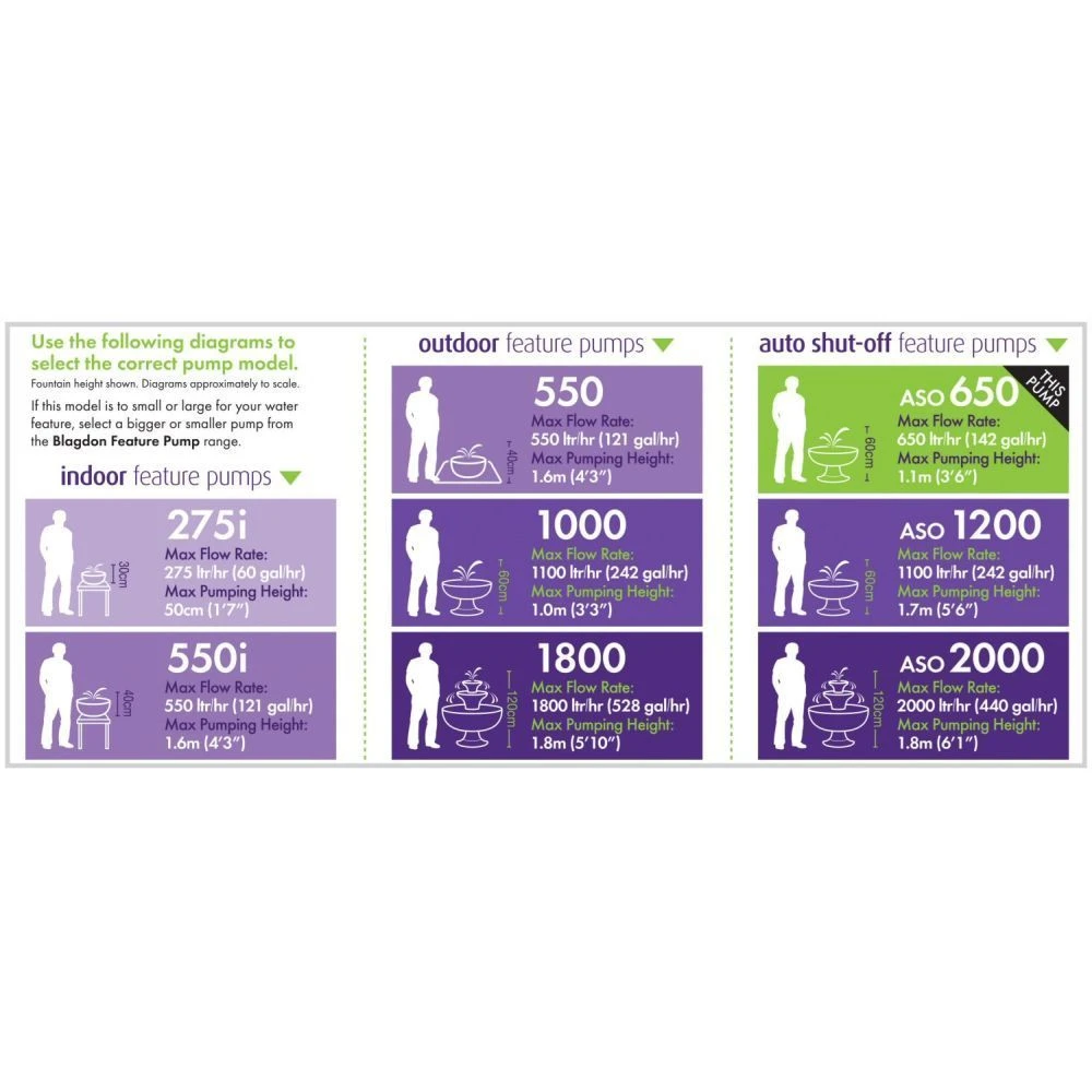 The Blagdon Auto Shut-off Feature Pump is a revolutionary pump with Auto stut-off sensors to prevent burnout by automatically turning off the pump when the water level is low and automatically turn on the pump when the water is refilled. The compact Blagdon 650 Auto Shut-off Feature Pump will supply flow to a fountain up to a maximum head height of 175cm at 467 Litres per hour. To help reduce cleaning and blockages, this pump includes a pre-filter cage and has an adjustable water flow.
